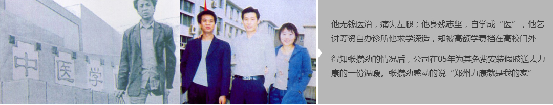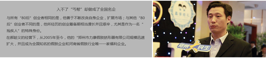鄭州市力康假肢矯形器有限公司(簡稱力康),是一家專業(yè)從事假肢矯形器的設計、研發(fā)、制作及裝 配的專業(yè)機構(gòu)。成立于1992年是河南省唯一一家福利企業(yè)。力康下設業(yè)務部、技術部、住院部、康復 部、售后服務部,并配有現(xiàn)代化的裝配車間和功能齊全的訓練大廳,為殘疾朋友康復訓練提供了可靠 保障??偨?jīng)理穿戴假肢多年,有著豐富的臨床經(jīng)驗和親身體會;多年來,力康已為全國幾十萬名殘疾 朋友安裝上舒適、美觀、耐用的假肢和矯形器具,使他們更大限度地恢復了正常的工作和生活?!爱a(chǎn) 品即人品”的質(zhì)量理念、先進的技術、實惠的價格、完善的售后服務是力康取勝的法寶……